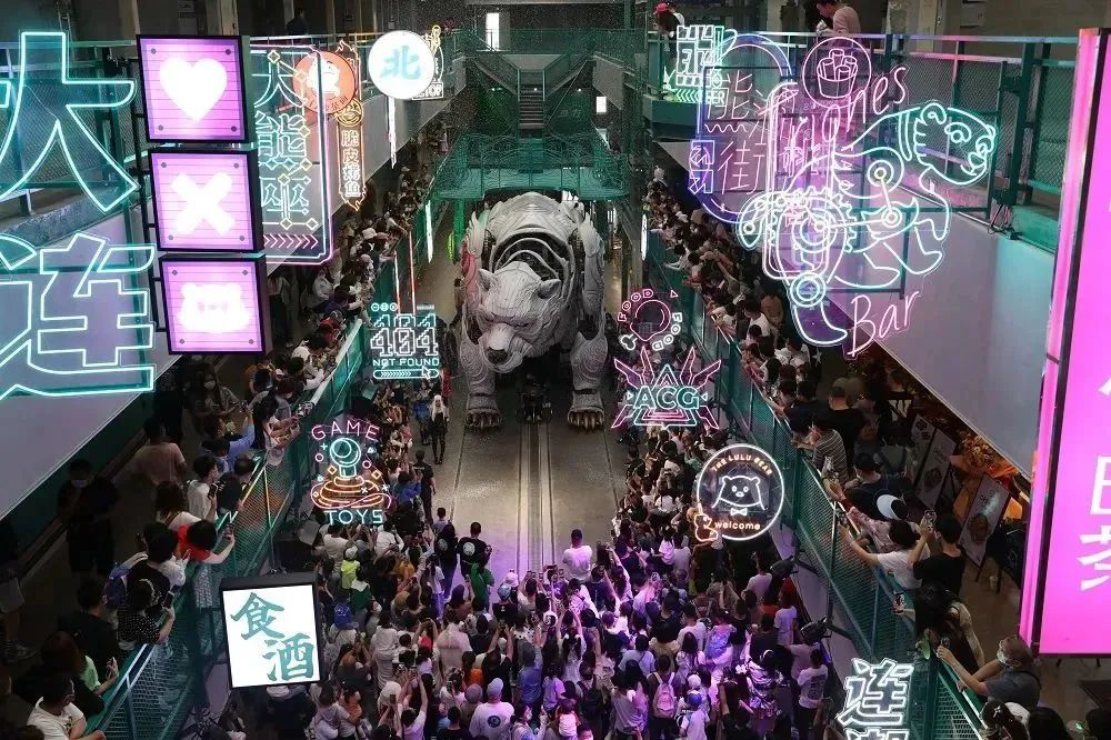大連熊洞街由一個(gè)“熊北北”IP和兩條大街組成,包括巨獸巡游、主題游樂、時(shí)尚文創(chuàng)、科技研學(xué)、特色美食、嗨玩夜場(chǎng)、主題活動(dòng)等元素,用文化科技藝術(shù)結(jié)合的方式,打造的一個(gè)尖叫地標(biāo),并通過巨熊北北這個(gè)超級(jí)IP,把文旅和商業(yè)業(yè)態(tài)有機(jī)融合到一起。大連熊洞街的核心IP巨熊北北身形巨大,據(jù)悉,“熊北北”是為大連專屬定制的城市IP,可實(shí)現(xiàn)高科技智能仿生互動(dòng)效果,例如扮鬼臉、噴水噴霧、揮手互動(dòng),也是該項(xiàng)目的引流利器。
